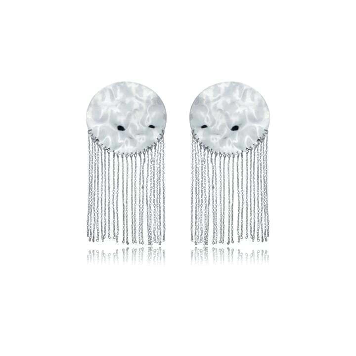 Com um design que apresenta um marcante círculo de metal levemente amassado do qual caem delicadas correntes em franjas, esta peça é um convite à liberdade e ao movimento.